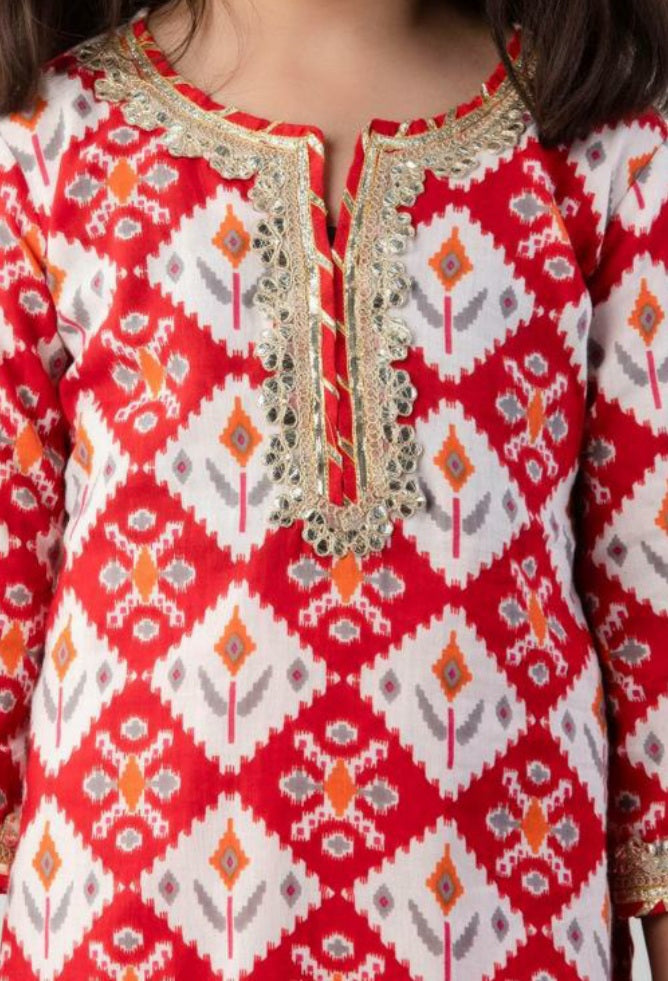 Red Kurta Sharara Kids Cotton Embroidered Set
